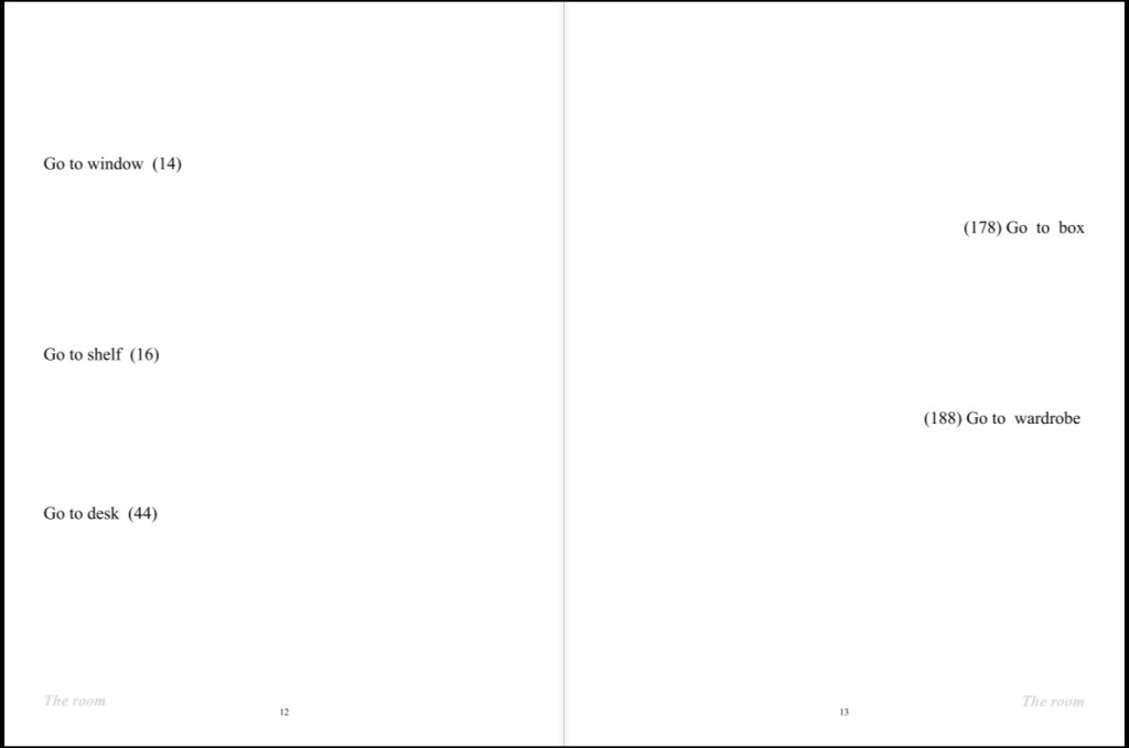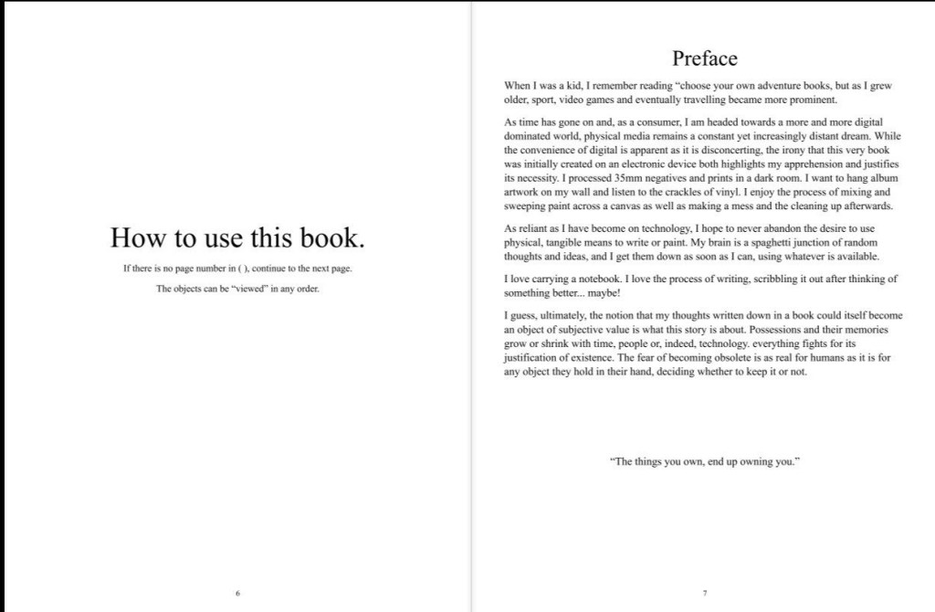 The twist– the game has been produced in parallel with a 292 page physical book version. The decision is three fold- to further develop the concept of owning physical possessions in an increasingly digital consumer landscape, to give the reader a direct interaction with the material beyond making choices or reading the story, but actively encouraging annotations, questions, or drawings and memories based on eliciting personal experiences.