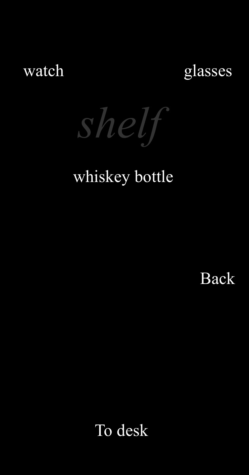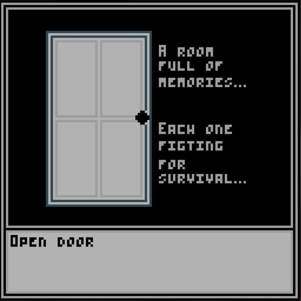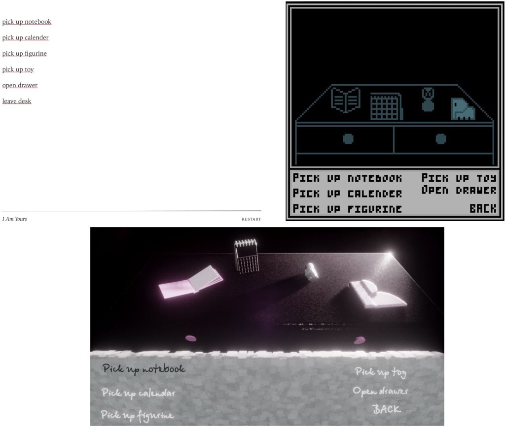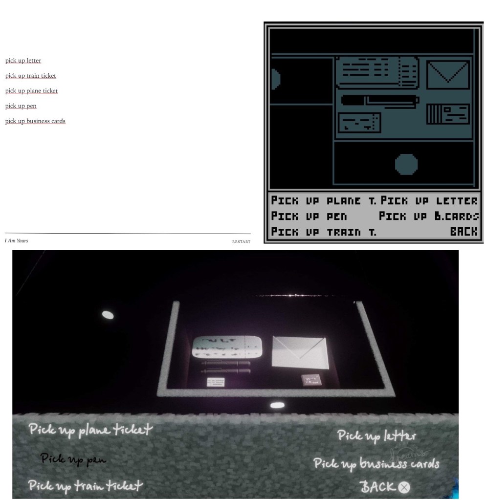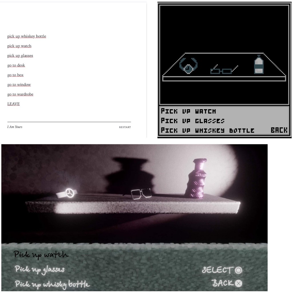 The concept– I am Yours is ultimately a minimalist text adventure style experience, exploring the psychological effect of memories, their connection to inanimate objects and their material or sentimental value. I have been experimenting with a few art styles but it feels more in keeping with the concept that it is text only- albeit with an intended format/ layout.