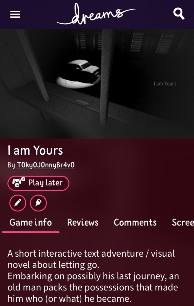 The story– I am Yours is about an old man embarking on possibly his last journey packing the remaining belongings that made him who (or what) he became. Without spoiling anything, there is a much, much bigger story to uncover. Ironically it was the first game I tried to make, which is now slowly progressing again.